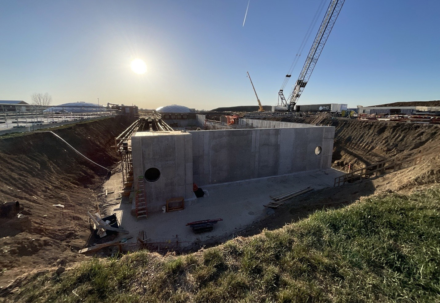 Aeration Basin, Secondary Clarifiers, Blower Building and Pump Building complete. -